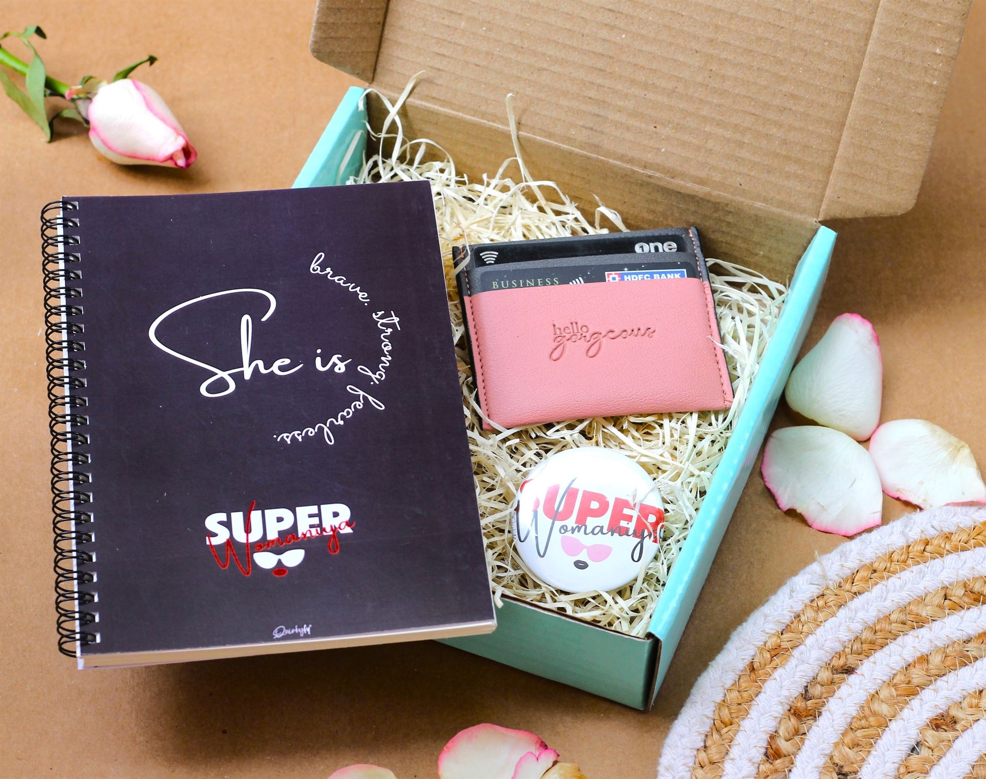 Embrace the fearless spirit of women with our Fearless Femme Collection hamper box for Woman's Day! This curated selection features a sleek She is Fearless Diary to inspire confidence and courage, a sophisticated Leatherite Card Holder for practical elegance, and a bold Super Womaniya Badge to celebrate her strength and resilience. Celebrate the remarkable women in your life with our Fearless Femme Collection, honoring their empowerment and fearlessness on Woman's Day and beyond.