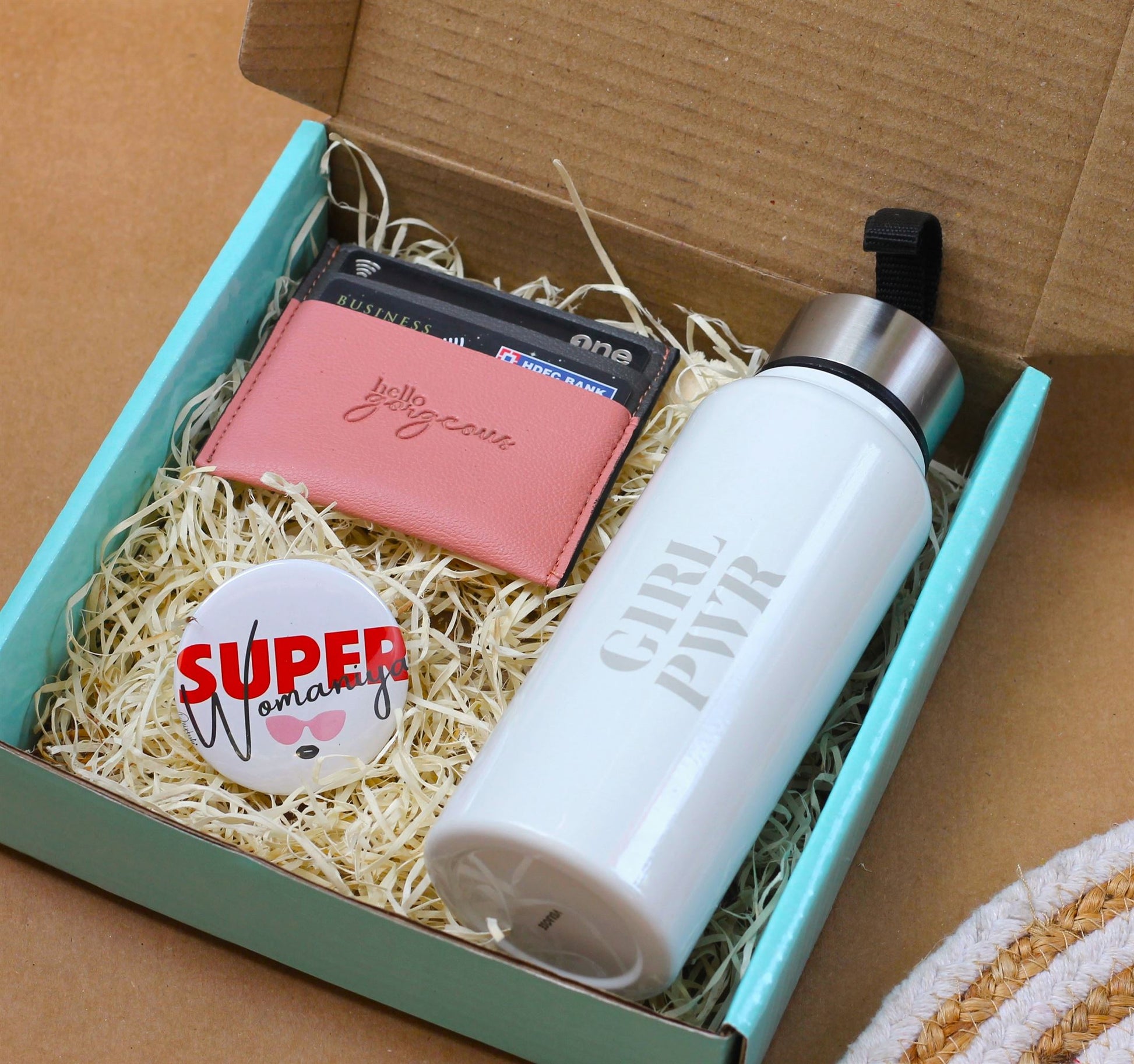 Elevate Woman's Day celebrations with our EmpowerHer Elegance Essentials hamper box! This curated collection features a vibrant Girl Power Sipper Bottle to fuel her aspirations, a stylish Leatherite Card Holder for her essential cards, and a bold Super Womaniya Badge to celebrate her strength. Show the remarkable women in your life your appreciation and support with our EmpowerHer Elegance Essentials, designed to empower and inspire on Woman's Day and every day.