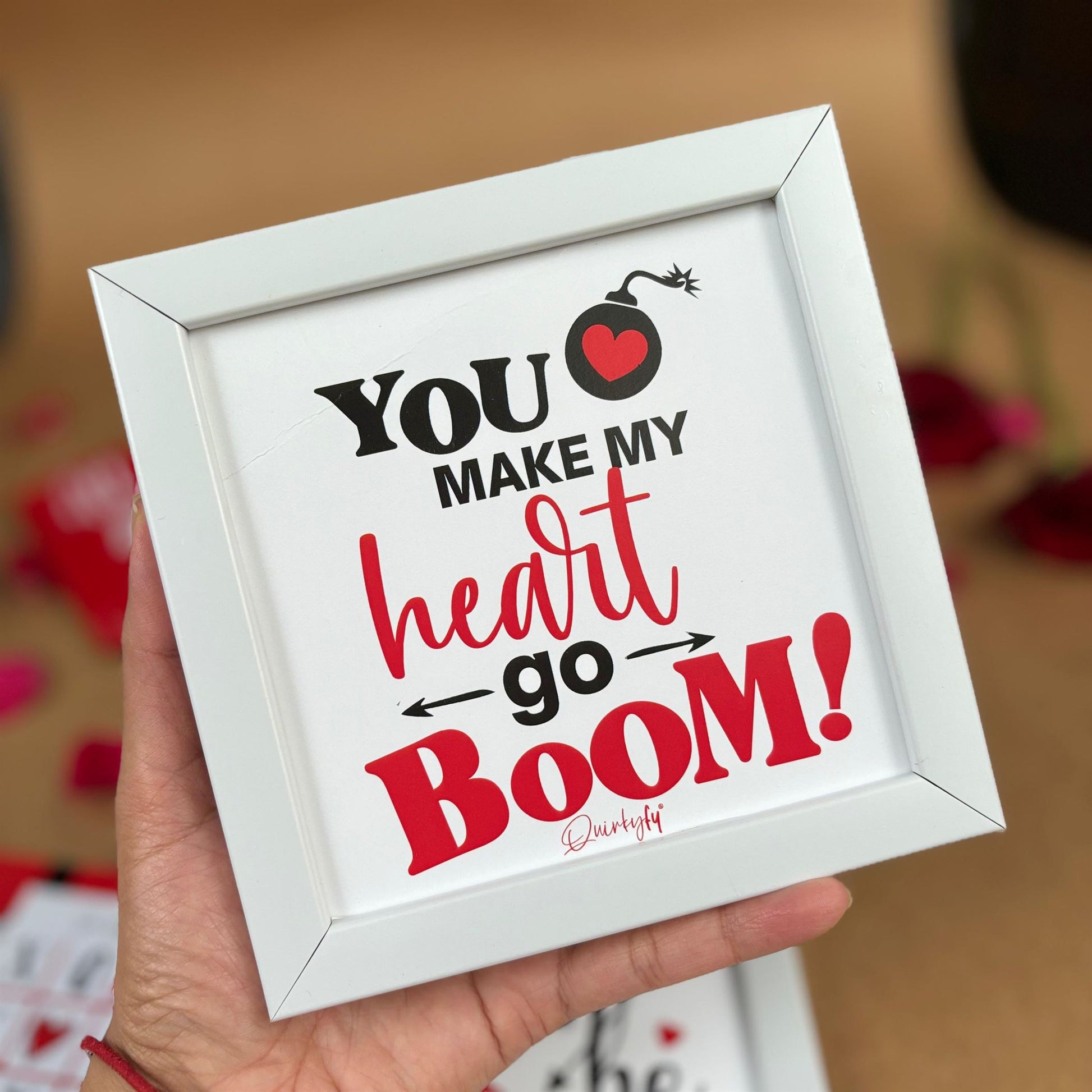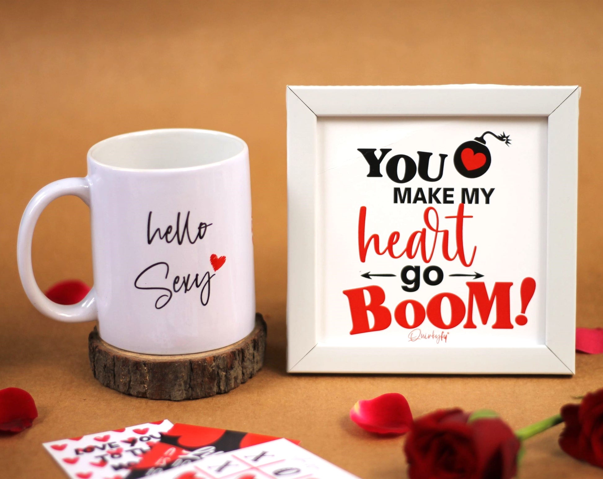 Introducing our exclusive Valentine Gift Box, a perfect expression of love and romance. This thoughtfully curated set includes a charming White Ceramic Mug adorned with a playful "Hello Sexy" quote, adding a touch of flirtatious charm to your morning coffee or tea. Accompanying this delightful mug is a 5x5 inches White Wall Hanging Frame featuring the sweet sentiment, "You make my heart go boom." Capture and display your cherished moments with this elegant frame, making every glance a reminder of the love that makes your heart race. Elevate your Valentine's Day celebration with this unique and heartwarming gift box that speaks volumes of affection and admiration.