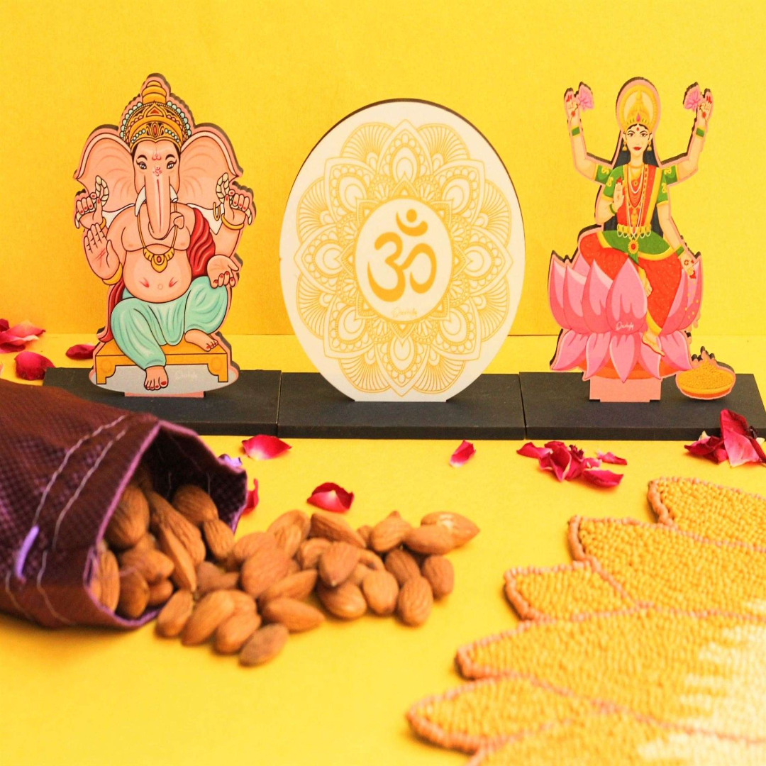 - 3 beautiful idols Om, Ganeshji & Laxmi Ji (approx 4inches in height).