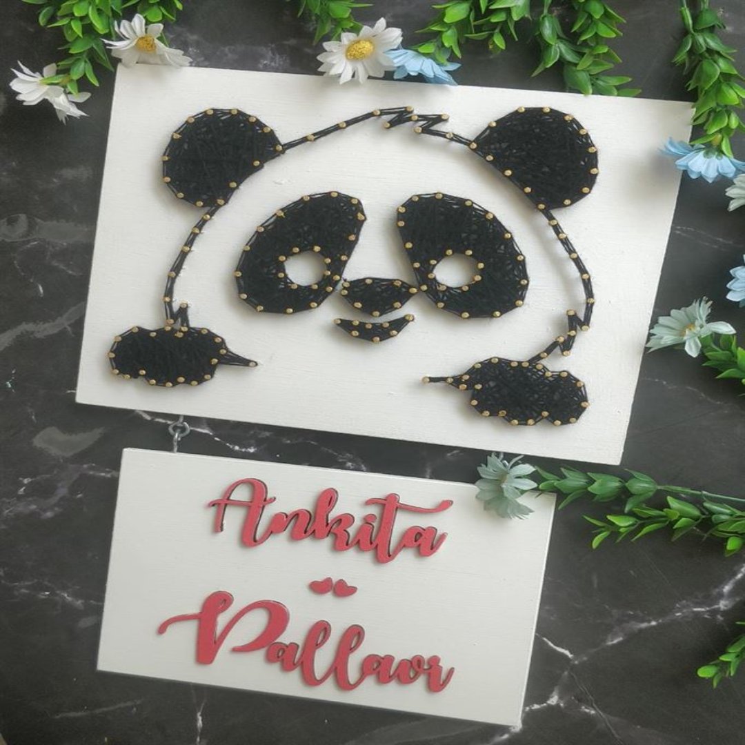 -The cute panda is in string art form (black wool and nails) and names are laser cut MDF hangpainted