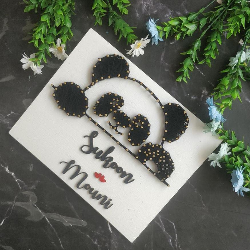 -The cute panda is in string art form (black wool and nails) and names are laser cut MDF hangpainted