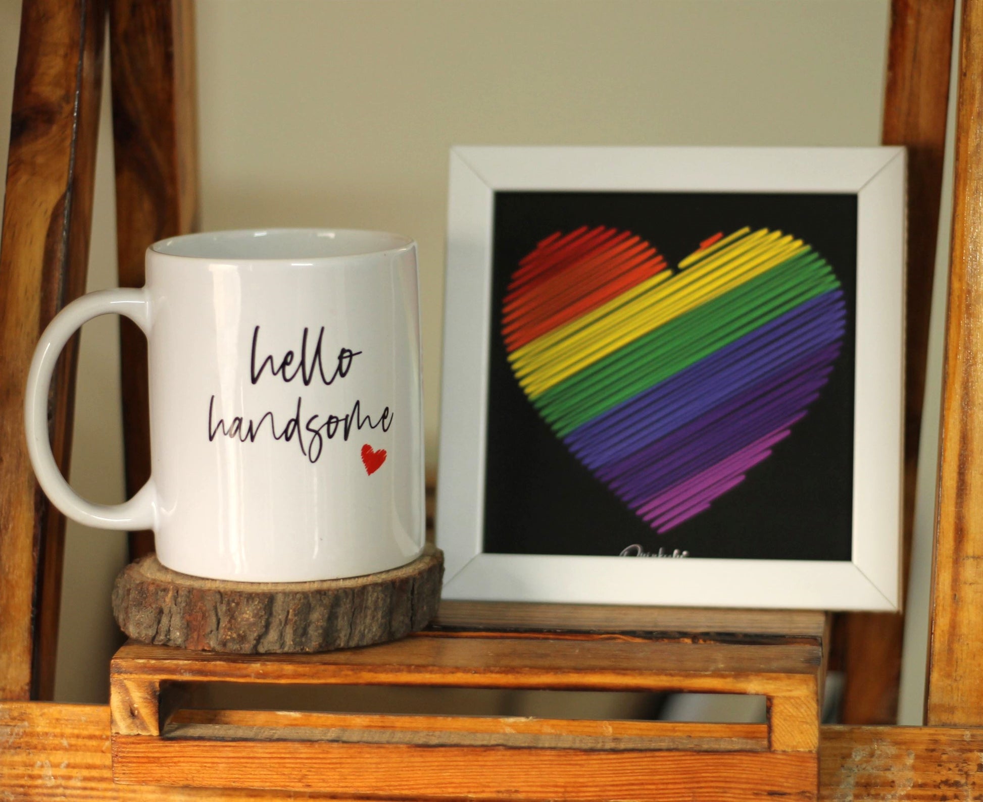 Introducing our Love in Color Valentine Gift Box, a celebration of passion and diversity. This special set includes a White Ceramic Mug featuring a playful "Hello Handsome" quote, adding a touch of flirtatious charm to your daily indulgence. Paired with it is a 5x5 inches White Wall Hanging Frame adorned with a vibrant rainbow heart design, symbolizing love in all its beautiful forms, particularly embracing the spirit of the LGBT community. Share the joy of inclusivity and express your affection with this unique and thoughtful gift box, perfect for celebrating love in every color of the rainbow.